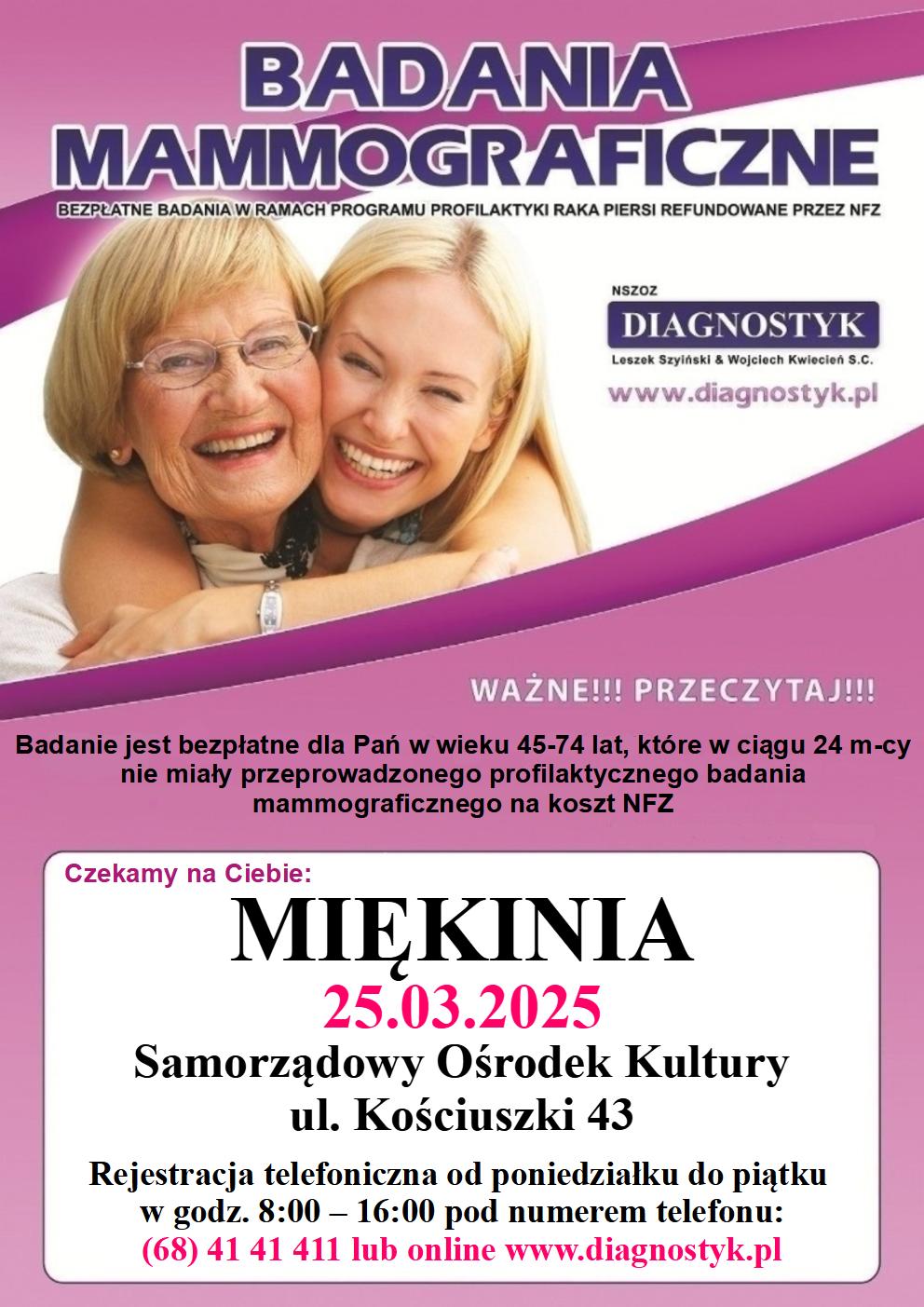 Dnia 25 marca 2025 r. (szczegóły w załączniku) przeprowadzane będą bezpłatne badania mammograficzne dla kobiet w wieku od 45 do 74 lat, które w ciągu ostatnich dwóch lat nie miały wykonywanych tego typu badań.