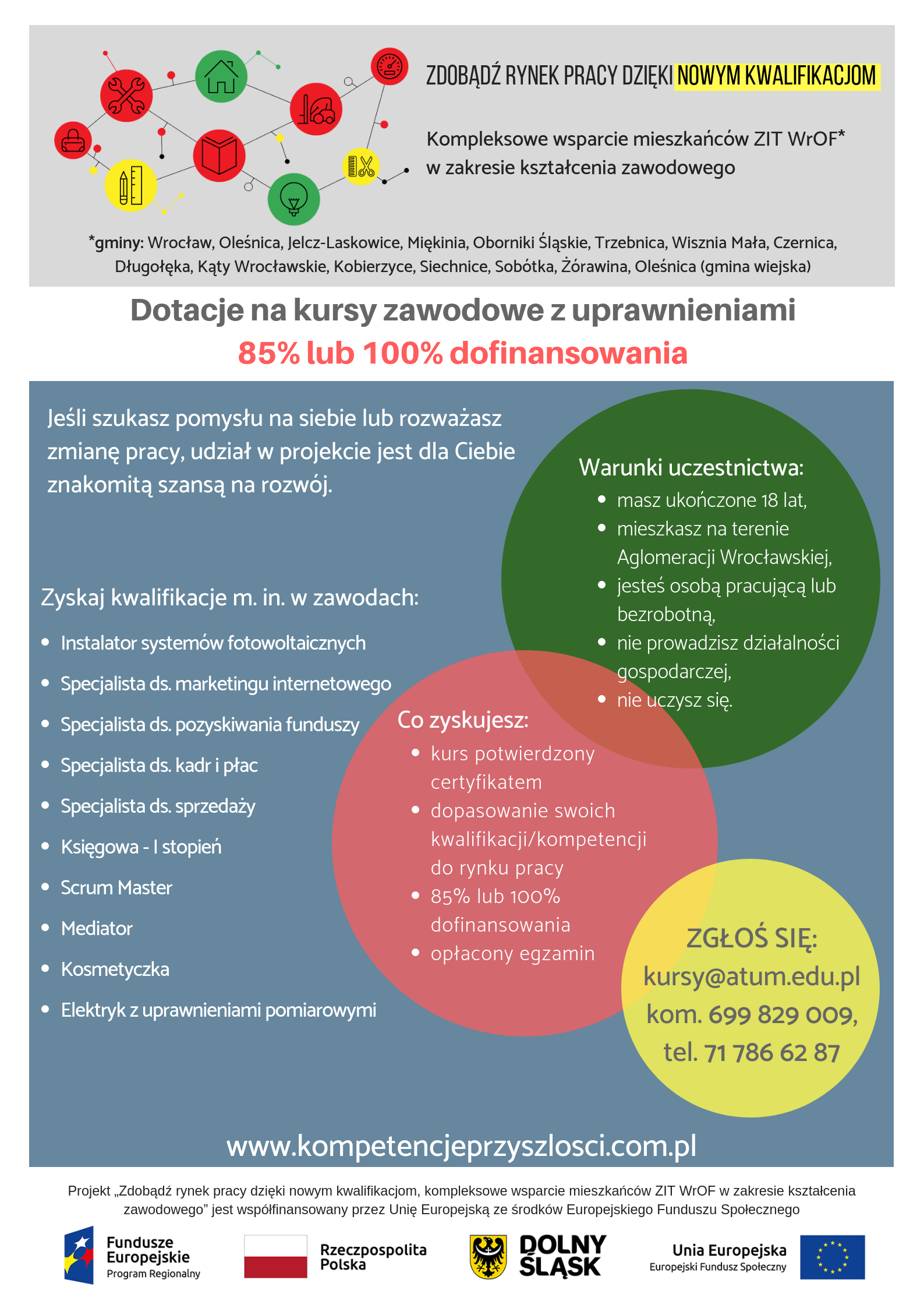 Informujemy o możliwości wzięcia udziału w projekcie pn.„Zdobądź rynek pracy dzięki nowym kwalifikacjom”, którego głównym celem jest dostosowanie kwalifikacji/kompetencji zawodowych osób fizycznych, mieszkańców obszaru Aglomeracji Wrocławskiej.