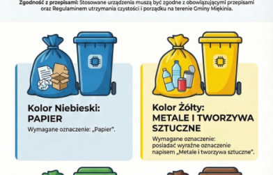 Informuję, że zgodnie z Regulaminem utrzymania czystości i porządku na terenie Gminy Miękinia odpady zbierane selektywnie należy gromadzić w odpowiednich urządzeniach, zgodnych z obowiązującymi przepisami.