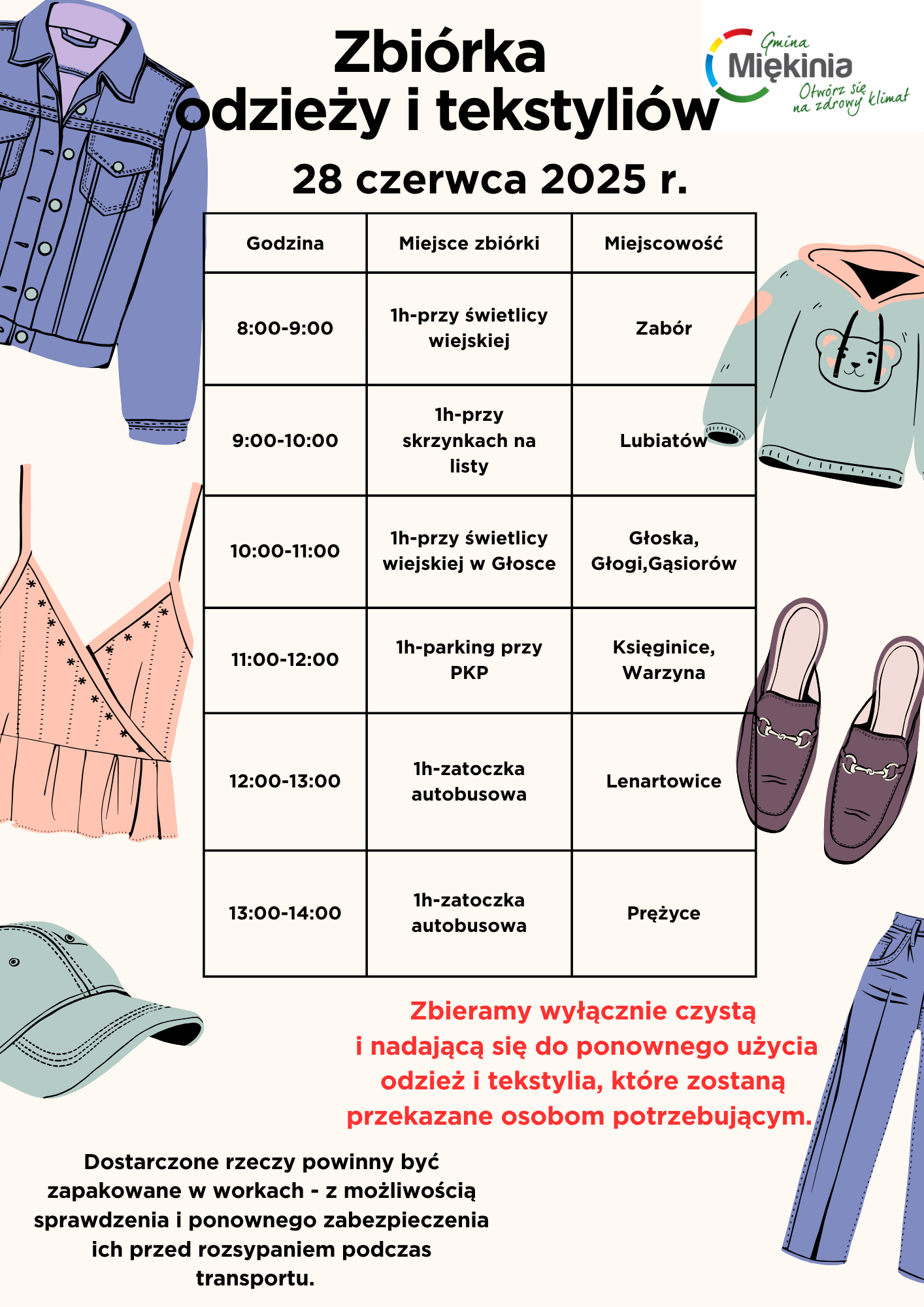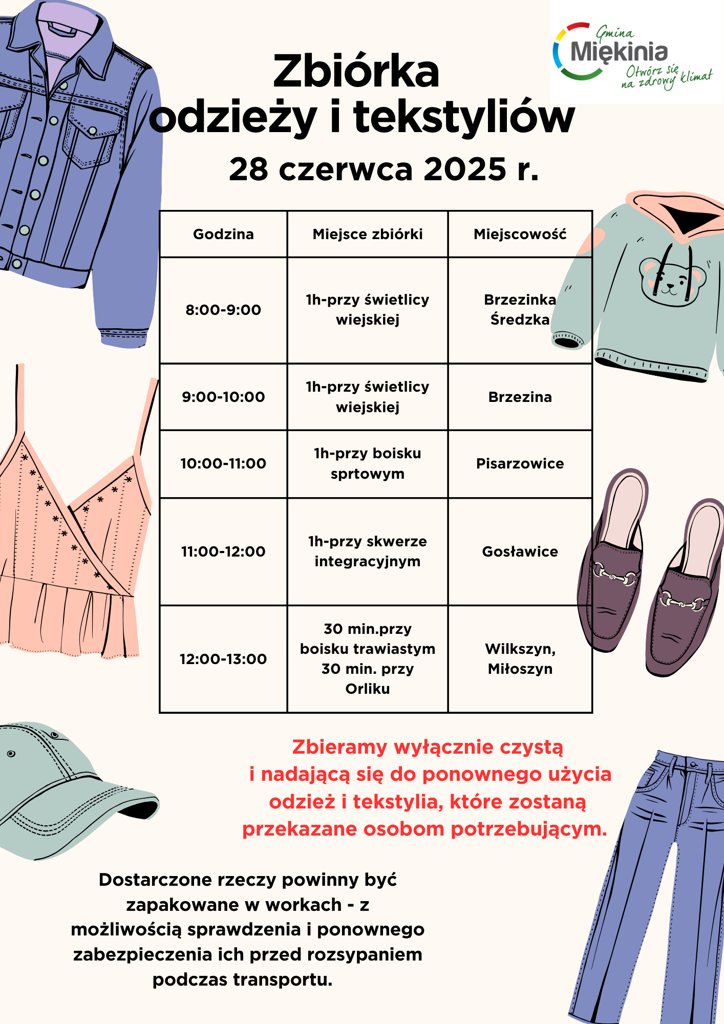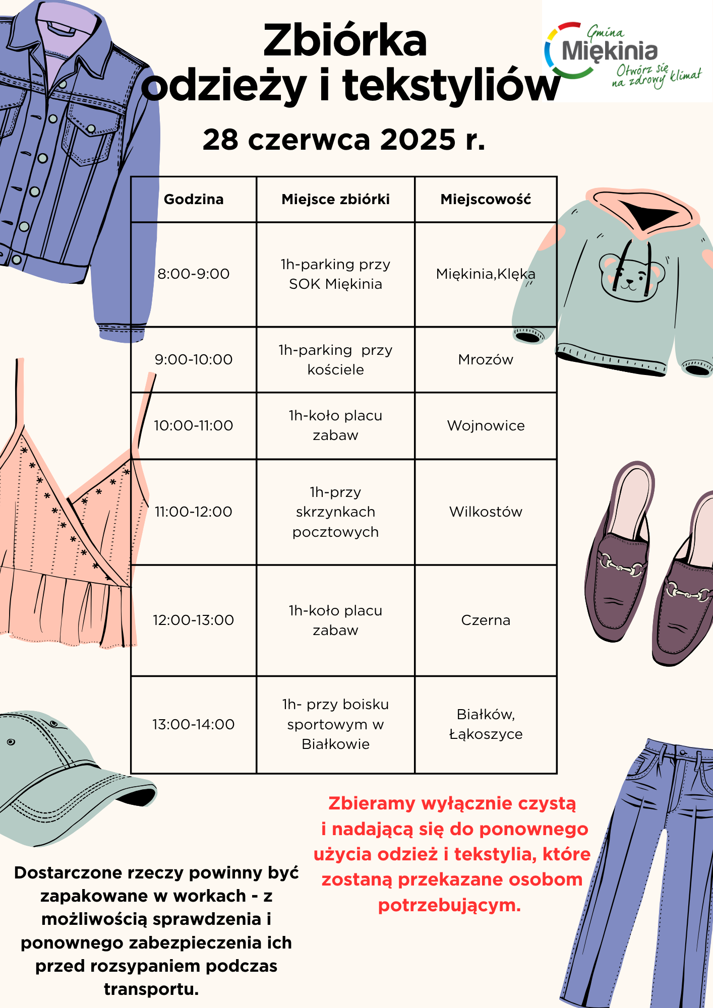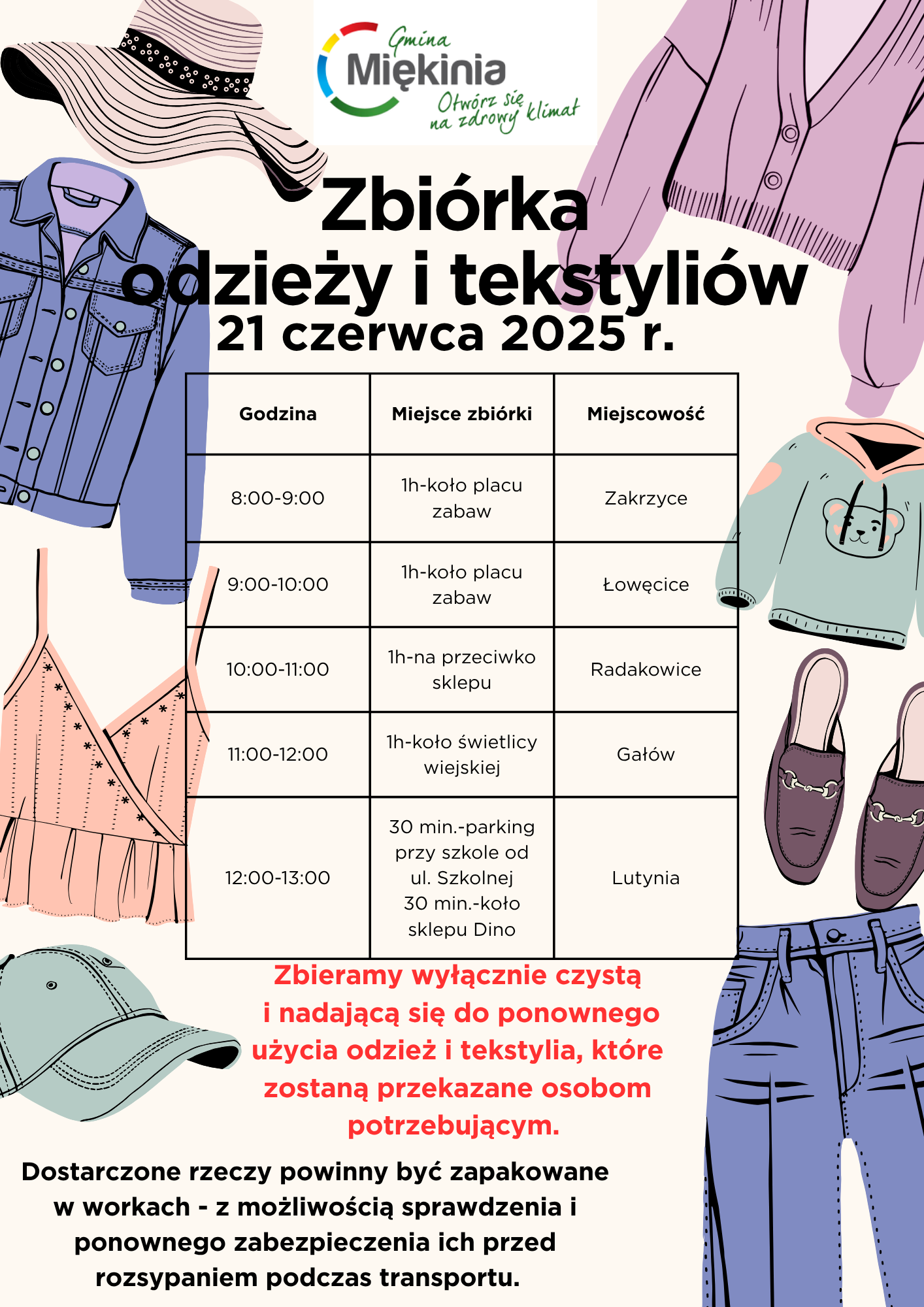 Wychodząc naprzeciw oczekiwaniom mieszkańców Gminy Miękinia informujemy, że rozpoczynamy akcyjną zbiórkę odzieży i tekstyliów.