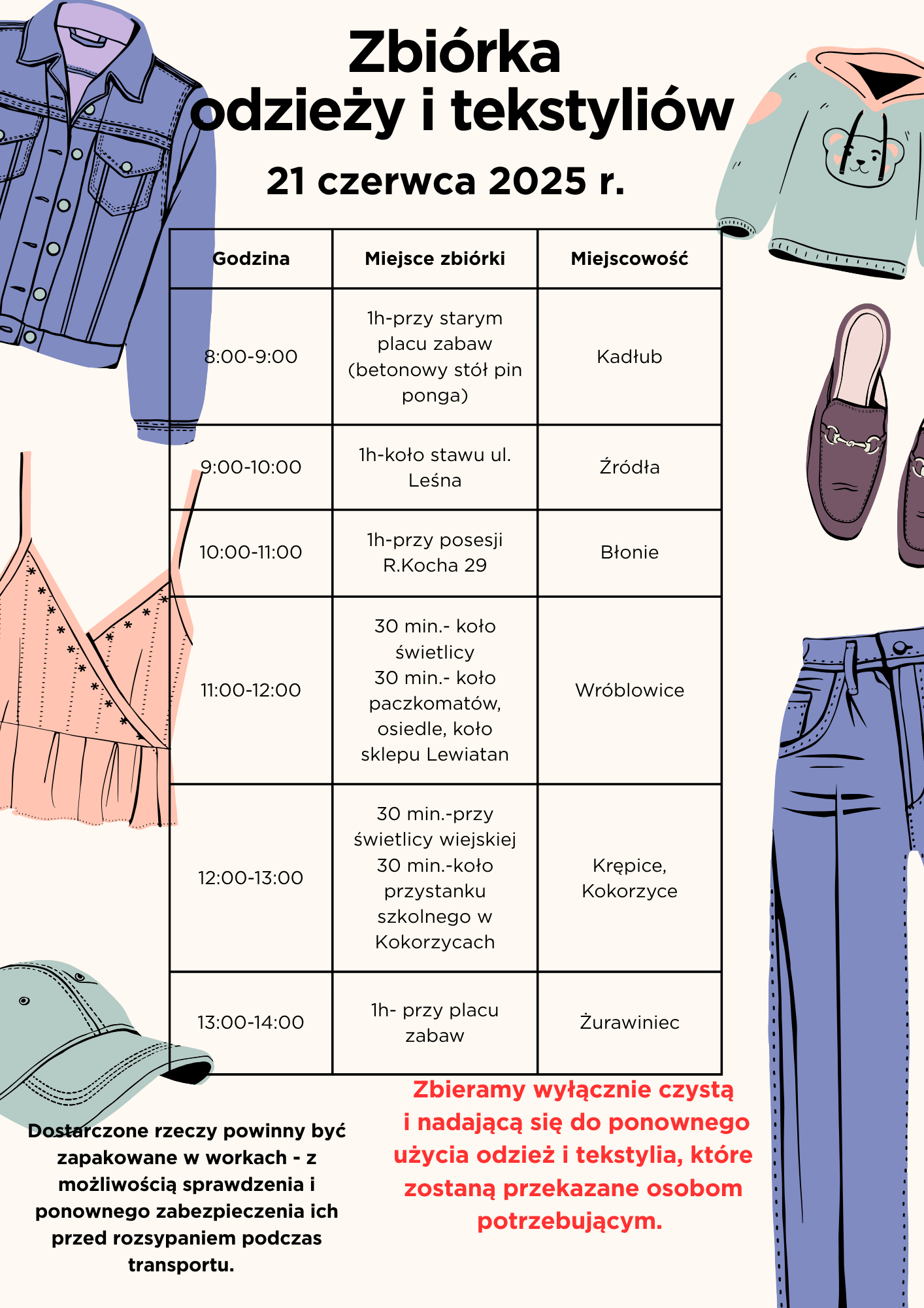 Odzież i tektylia nadającą się do ponownego użytku należy dostarczyć w workach do wyznaczonego miejsca o określonej godzinie. Ekipa pracowników Zakładu Usług Komunalnych w Miękini odbierze je od Państwa. Wszystko przekażemy osobom potrzebującym.