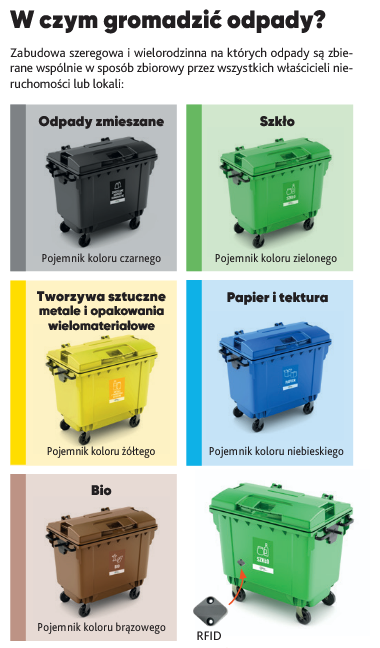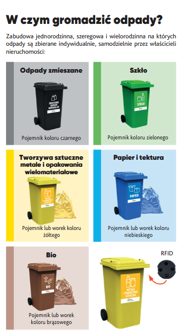 Zachęcamy do wyposażenia nieruchomości w odpowiednie pojemniki, a także do złożenia wniosku o wyposażenie nieruchomości w pojemnik na odpady komunalne oraz jego oznakowanie (oczipowanie) znacznikiem RFID.