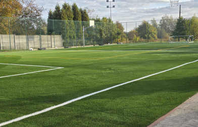 Podbudowa została wyrównana i uzupełniona, a obecnie trwa układanie nowej nawierzchni ze sztucznej trawy na macie absorpcyjnej. Nowa trawa jest zasypywana piaskiem i granulatem EPDM, co zapewni jej trwałość i bezpieczeństwo użytkowania.