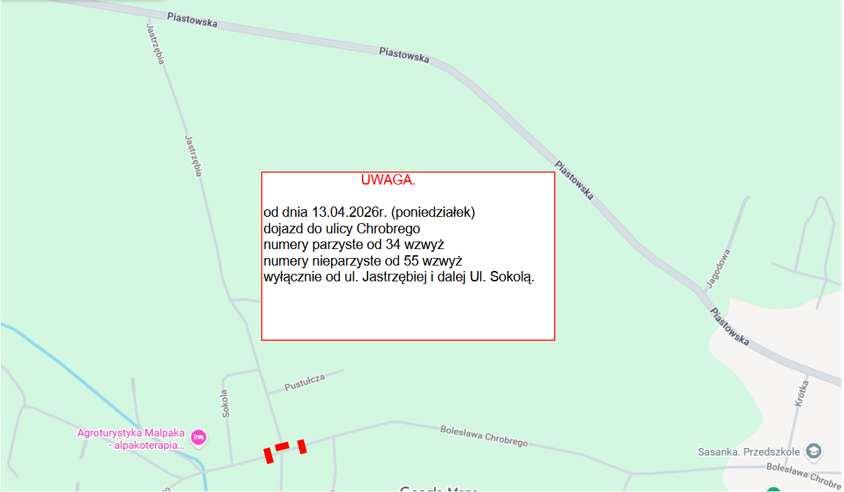 Dojazd do posesji znajdujących się na ul. Chrobrego numery parzyste od 34 wzwyż oraz numery nieparzyste od 55 wzwyż możliwy będzie jedynie od ul. Jastrzębiej i dalej ul. Sokolą.